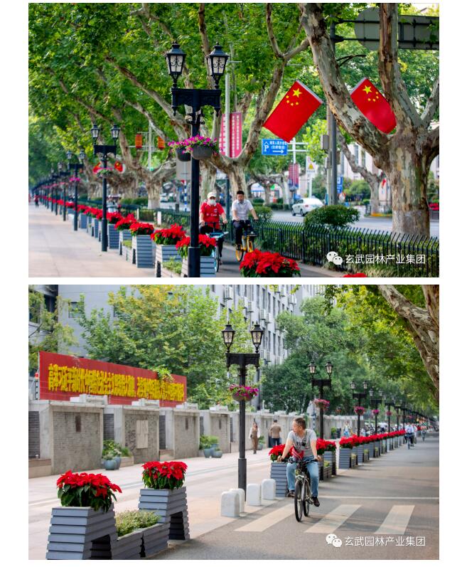 對北京東路、市府門前路、長江路、中山東路、中山路、鼓樓廣場等重要節(jié)點采用組合花箱、護(hù)欄花箱、花碗、燈桿掛花、彩色花球等多種組合搭配,重點選用亮金女貞、三角梅、龍血樹、變?nèi)~木、深藍(lán)鼠尾草、孔雀草、一品紅、歐月、垂掛牽牛等花卉,豐富城市街角,營造出濃厚的節(jié)日氣氛。